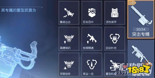 加点:主点百发百中,活性装甲,步枪精通,幸运一击,加长弹夹,坚忍不拔,重装出击,高爆弹药,自动补给深度创伤,重型机枪。
