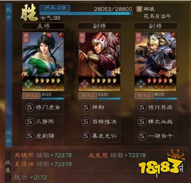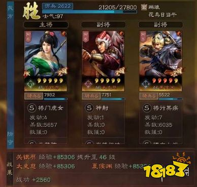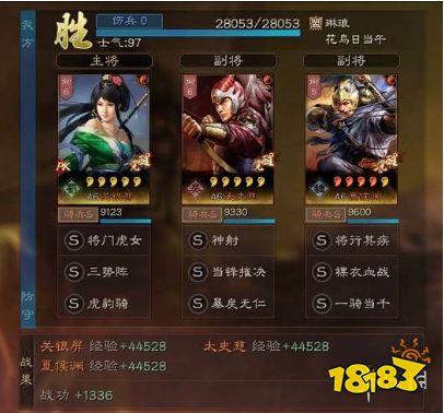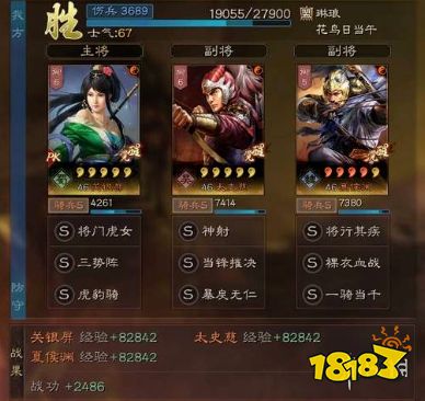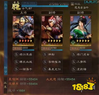 阵容点评:关妹1速,配合三势阵提高自带战法的触发几率,同时虎豹骑带来的武力和突击战法概率加成,保证前期三个武将都稳定拥有比较高的输出爆发强度!太史慈二速打当锋,夏侯渊速度低1点,跟上输出爆发伤害!队伍优势在只要不遇到先攻铁骑菜刀队都有一战之力,即便是打盛气队伍也不是一定翻车,打盾基本上都是大优势,并且经常低战损吃掉!