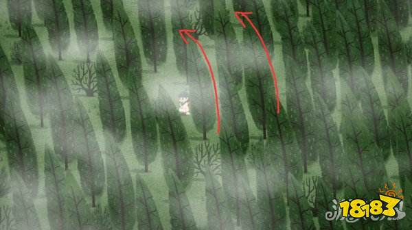 这一片迷雾森林的走法,顺着树木指向的方向不断换方向行走就行了。