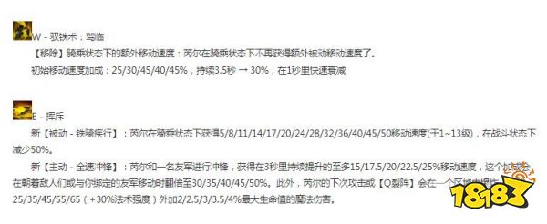 新【被动 - 铁骑疾行】:芮尔在骑乘状态下获得5/8/11/14/17/20/24/28/32/36/40/45/50移动速度(于1~13级),在战斗状态下减少50%。