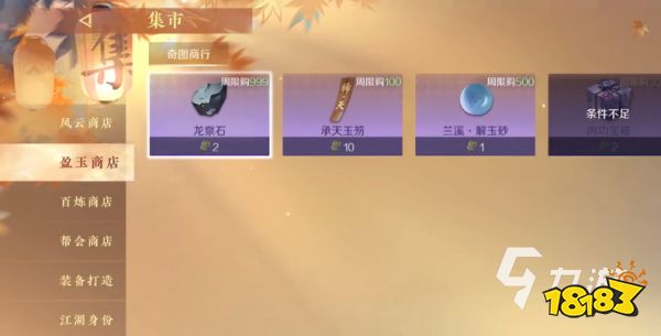 至于盈玉商店的话,里面的商品都是升级材料,例如装备的锻造材料,还有升级内功的秘籍等物品。都是前期培养角色需要用到的,只不过这些商品需要纹玉兑换,代价更高一些。百炼商店的话都是一些装备。这些装备都是紫色装,如果前期没有橙装的话,用这些也不错。