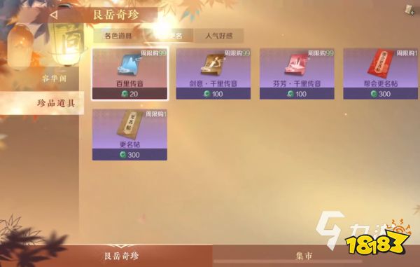 进入游戏主页后,大家可以点击右上方的奇珍,接着便会跳出集市的页面。继续点击集市便可进入,集市里面的商店很多。第一个就是风云商店,想要兑换里面的物品,就需要积攒风云令,风云令可以通过做活动、刷副本获得。