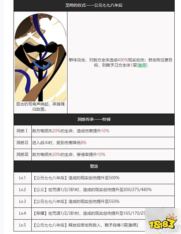整体来看,未锈铠是一名击败收益十分大的现实输出角色,能为队伍带来高额现实创伤,其洞悉增益在后期洞三后整体输出十分强劲。但本身技能主要收益来源多为击败收益,则在队伍中更适合充当副C的角色。