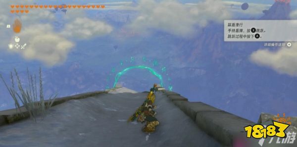 3.随后跟随蓝色光点的指引前往地面指定位置,落到地面后继续使用踩盾滑行穿过所有绿圈。