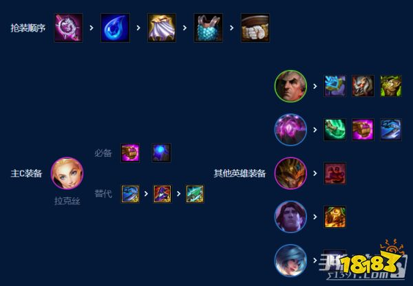 乌鸦的离子和狂徒、拉克丝的法爆相对关键,其他的装备可以根据局势出,缺重伤就做日炎,外面赌狗多就做巨杀。