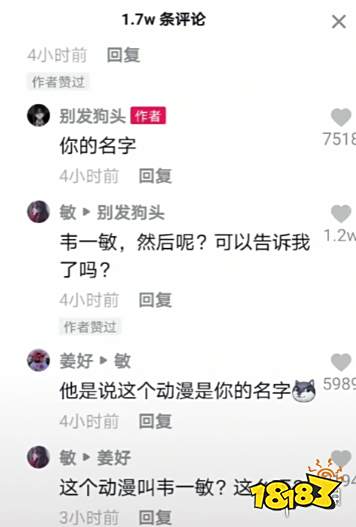 然后另外一位好心网友再次解释了是这部动漫叫作《你的名字》,但是还是没有加上“《》”,导致韦一敏同学又以为这部动漫就叫韦一敏,于是“敏”又回复到“什么动漫叫韦一敏?这么巧吗?和我一样”。