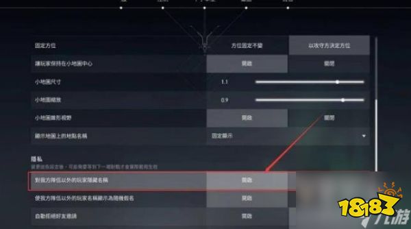 2、进入设定选项后,在游戏隐私中找到对我方队伍以外的玩家隐藏名称选项,然后将该选项右侧更改为开启即可隐身在线。