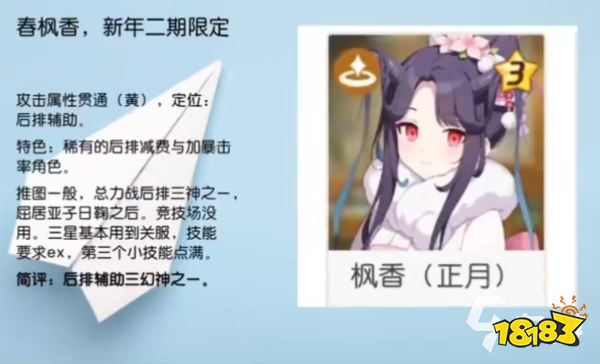而第三个推荐的角色就是春枫香,春枫香作为一个新年限定角色,自身拥有非常非常稀有的后排减费和加暴击的能力,可以给主力角色增加一定数量的暴击,并且减少费用。在整个游戏里这两个能力都是非常稀缺且有用的
