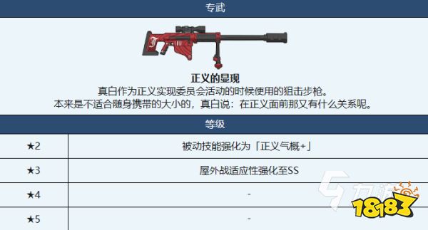 真白的定位是爆发,她的专属武器“正义的显现”十分的强大,在升级到三星的时候,还可以提升角色在野外的适应性哦,这让真白成为了当之无愧的“野战之王”。