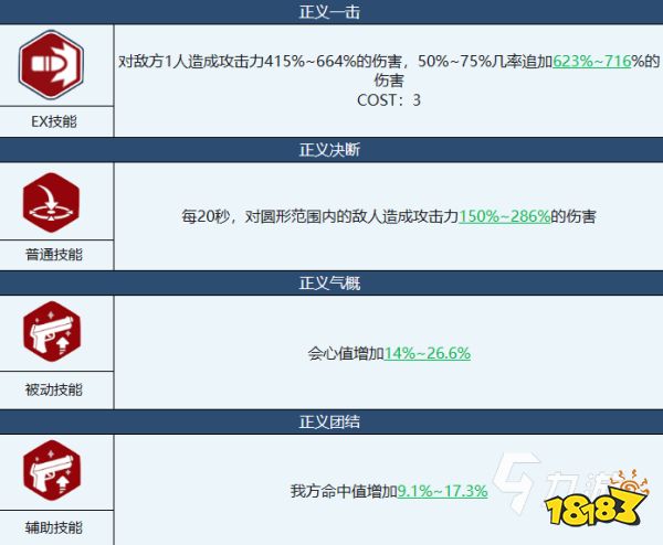 真白的技能同样也很“超模”,首先是ex技能正义一击,可以对他敌方的单体单位造成巨额的伤害,同时还有很大的概率追加双倍伤害哦!在高难本中具有不俗的出色表现。被动技能以及辅助技能则可以提升暴击率以及命中率,互相叠加之下,可以说,没有哪一位角色的瞬间爆发可以超越真白了。