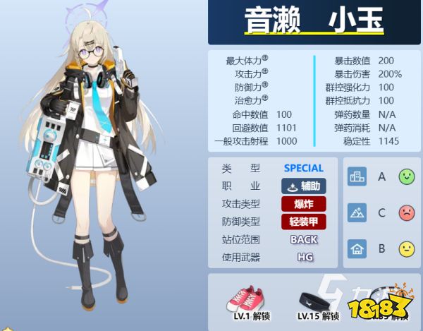 而她的基本技能-窃听弱点则是一个伤害类型的技能,每三十秒对一名敌人造成攻击力249%的伤害,使敌方攻击力减少18.9%,持续二十秒。这个技能是音濑小玉唯一的伤害技能,伤害类型为爆炸的音濑小玉在释放此技能时,对轻装甲类型的敌人将造成翻倍伤害。