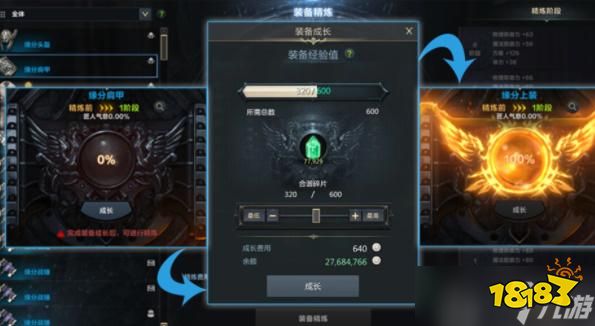 1、装备成长:点击[成长] 按钮,使用“碎片”获得足够的装备经验,即可进行精炼。