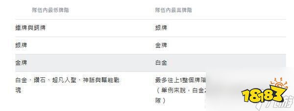 当组队人数少于3人时必须符合上述排阶差距条件。不支持四排,因为队伍中剩下的单排玩家通常会有不良的游戏体验。