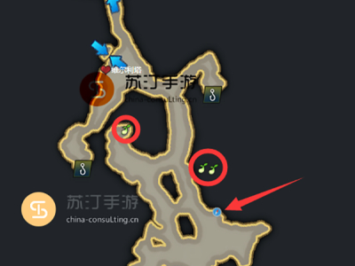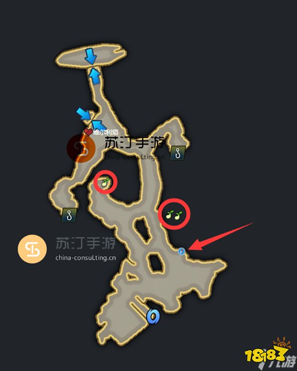 命运方舟诺托斯岛:3个摩可可种子,箭头指向的位置是地图的隐藏通道,从隐藏通道中可以获取2个摩可可种子,还有1个在地图中就可以获取,位置如图: