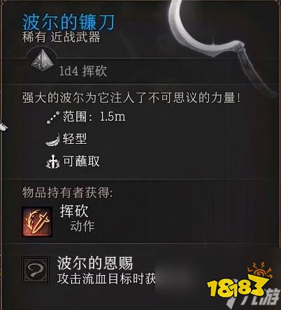 1、波尔的镰刀:1d4挥砍,单手近战镰刀,攻击流血目标时获得优势。