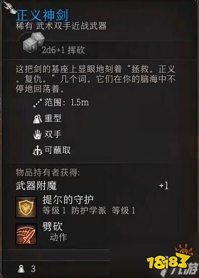 1、正义神剑:2d6+1挥砍,双手近战大剑,获得提尔的守护法术,虔诚护盾效果,附赠动作开启,每场战斗可使用一次。