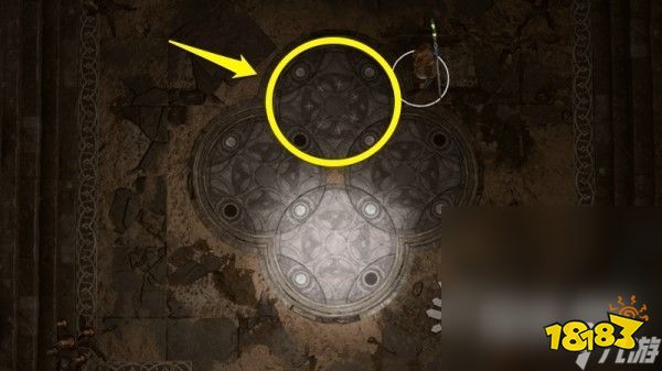 谜题解法:破解石盘谜题,或直接对上锁的门附近的机关使用盗贼工具即可跳过此谜题(位置参考下方图片),需要通过感知检定