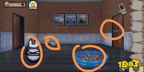拿池子里的四个黄色海洋球,墙边拿钥匙和平板;企鹅身上拿绳子,拿完再点一下,将企鹅挪开。去第一个房间,用钥匙开花瓶下的柜子,获得盒子。