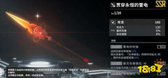 终末阵线斑比专武推荐选择贯穿永恒的雷电,斑比装备时女神姿态持续时间延长到13秒,并且增加20%攻速,基础属性有提升最终伤害和攻击速度,也非常契合斑比的普攻输出节奏,专属效果提升简单暴力,军衔7后加成更加明显,氪佬推荐搞一把。