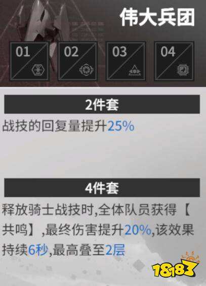 4件套让艾琳切出来之后放一次大招,之后直接提升20%的伤害,能够在boss护盾被击破之后打出高额的爆发,目前游戏中基本上除了伟大兵团之外没有其他更适合艾琳使用的了。