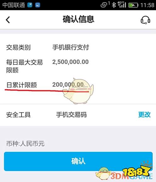 7、在弹出界面上,选择“日累计限额”,输入你想要设置的金额,如图中所示,比如设置20万,然后点击“确认”;