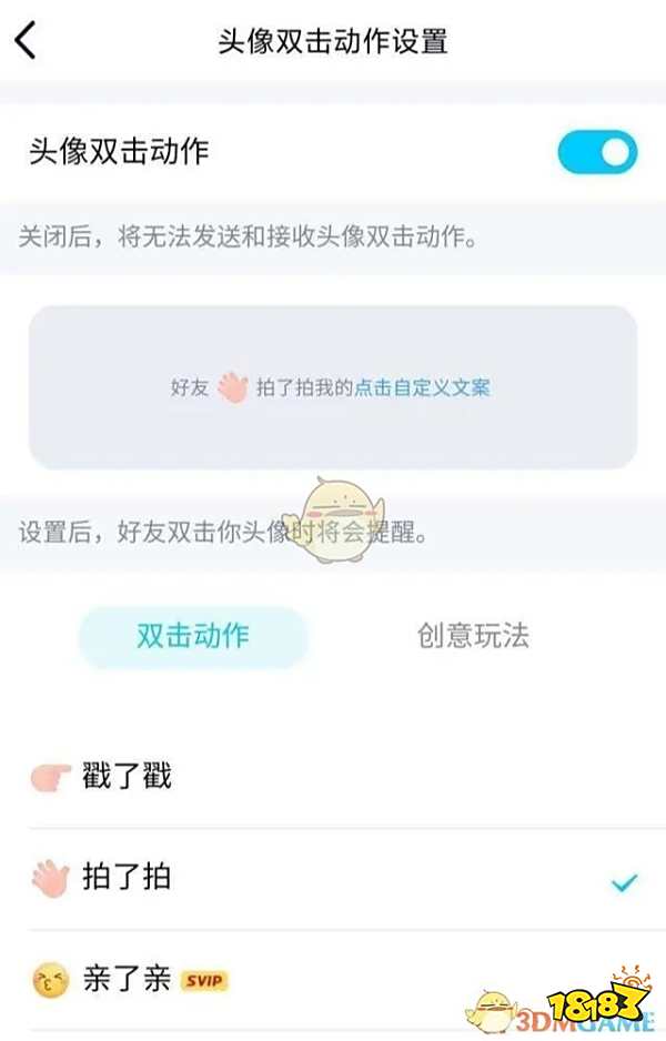 3、在头像双击动作设置中,即可开启或关闭拍了拍,还可以自定义文案哦!