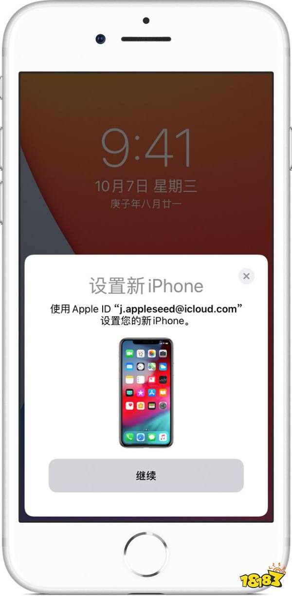 1.将新设备开机,并将它放在当前设备旁边。“快速开始”屏幕会出现在当前设备上,并且屏幕上会提供使用您的 Apple ID 设置新设备的选项。确保这就是您要使用的 Apple ID,然后轻点“继续”。如果您没有看到这一选项而无法在当前设备上继续操作,请确保蓝牙已打开。