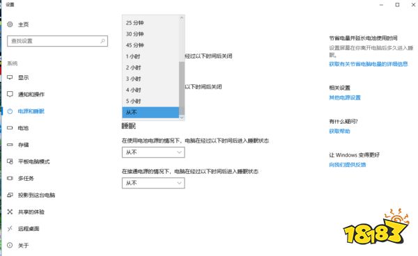 3、点击【睡眠】下拉框,在这里面选择要设置的时间,如果不需要睡眠,可以直接选择【从不】,然后屏幕选项中也可以设置成【从不】