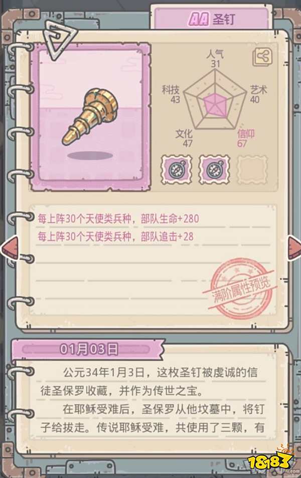 中间格研究获得AA级紫色贵重圣钉碎片,共计3次,可获得80碎片,并且蜗牛领导力+3,贵重属性为每上阵30个恶魔兵种部队攻击+28,部队防御+28。技能为: