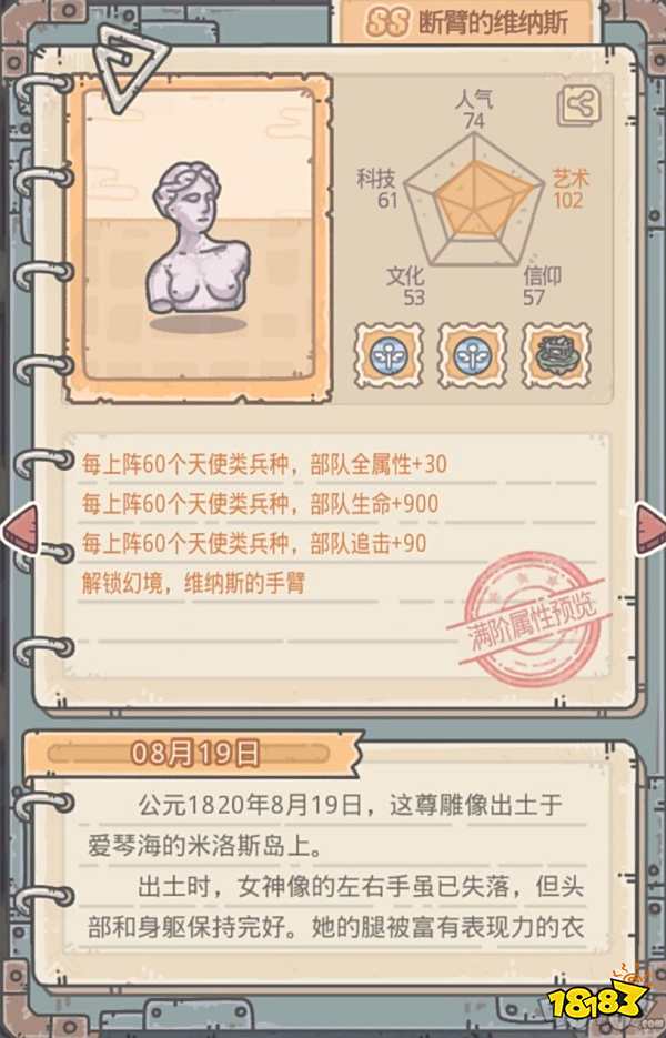 研究完成后获得SS橙色贵重断臂的维纳斯贵重碎片,共计5次,共获得280碎片,属性为每上阵60个天使兵种攻击共计部队追击+90,生命+900,全属性+30,解锁维纳斯的手臂幻境。技能为:1.希域博物馆改造(高阶),置于希域博物馆,希腊探索对使徒伤害+30%,2.希域博物馆改造(高阶),置于希域博物馆,希腊探索15%几率双倍情报点;3.石材工坊改造(高阶),置于石材工坊,石材产量+30%。希域博物馆改造是未来神技,还是非常有必要的。