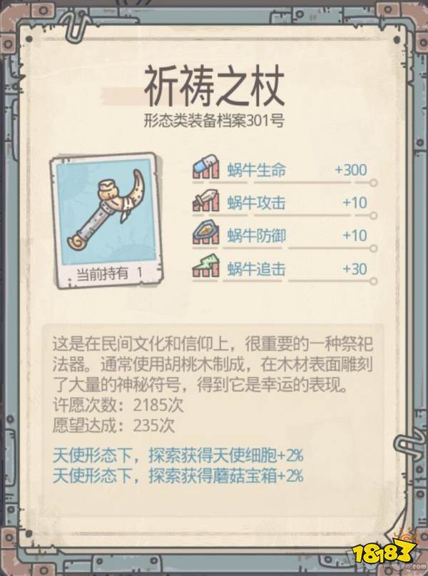 研究完成后可以获得天使形态专属装备—祈祷之杖。在天使形态下增加探索获得天使细胞与蘑菇宝箱,还可以与鼠胆侠胜利奖励装备莲台天使形态下每回合恢复生命)合成为红装+1形态。